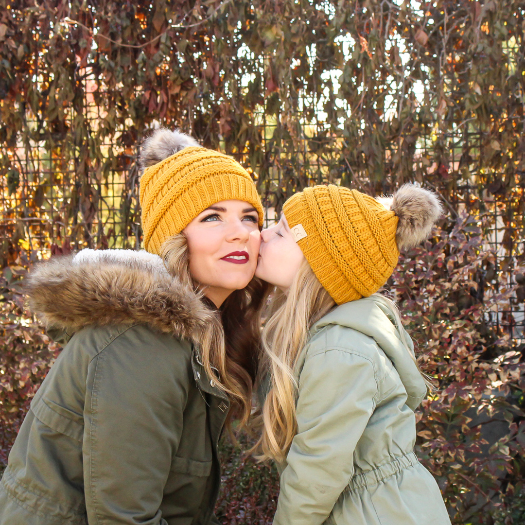 This Mom & Me set includes adult and kid versions of the same color with a faux fur pom.