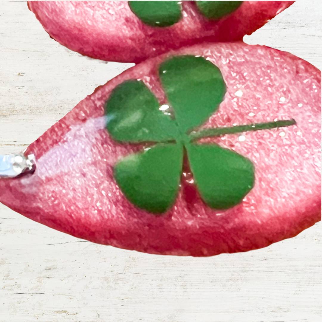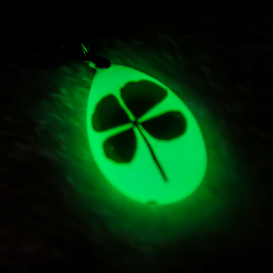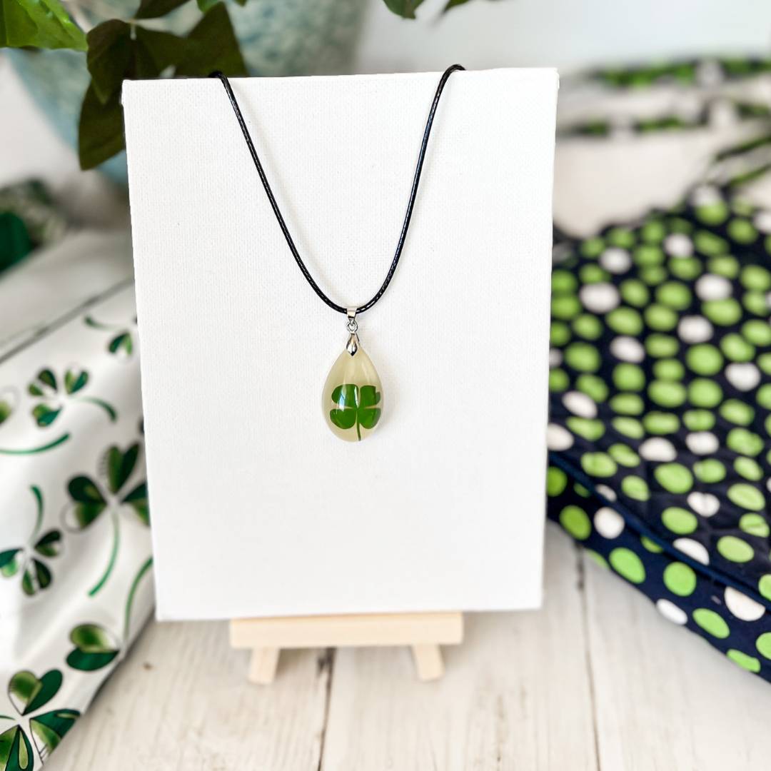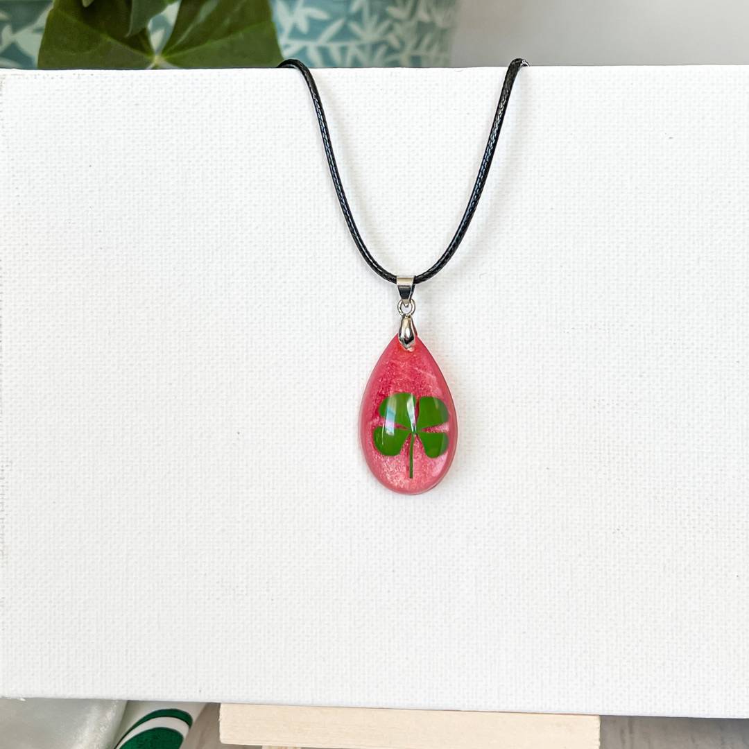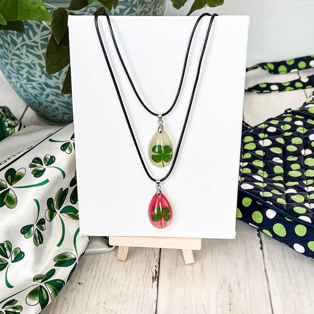 You'll feel lucky all year with one of these clever clover pendant necklaces. The REAL 4-leaf clover is suspended in a sparkly pink or clear resin teardrop (1 3/4" x 3/4") and hung from a black wax cord necklace that has a length of between 17 3/4" to 18 1/2" with the zinc alloy lobster clasp (lead & nickel safe). And the most fun part...the clear version glows a vibrant green in the dark!