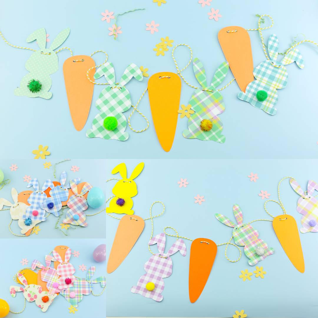 Make a hoppy addition to your Spring décor with and adorable banner. This charming 55-inch-long garland features an adorable lineup of 5-inch-high bunnies and carrots, each crafted from high-quality paper and topped with fluffy pompom tails for extra cuteness.