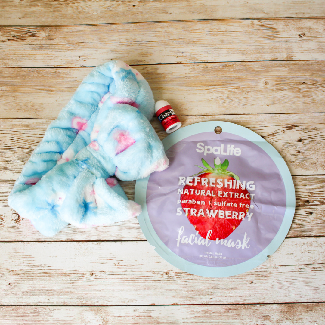Facial Kit includes: 1 sheet mask, 1 soft & fuzzy bow headband, and 1 mini lip balm.