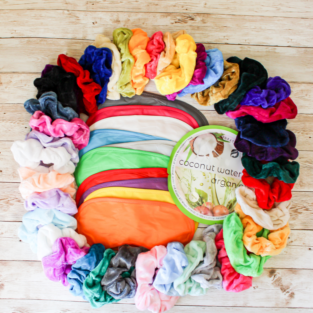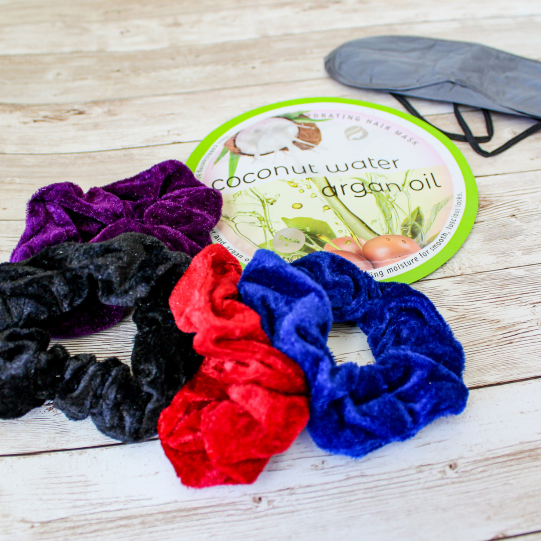 Hair Kit includes: 4 velvet scrunchies, 1 hair mask, and 1 satin sleep mask