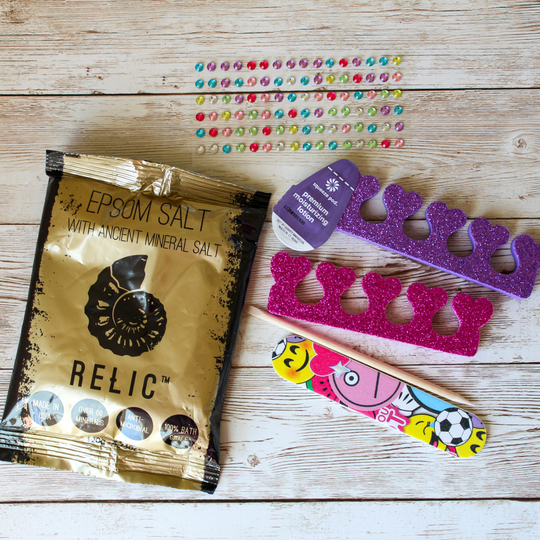 Pedi Kit includes: Bath/foot soak, toe separators, emory board, orange stick, and moisturizer.