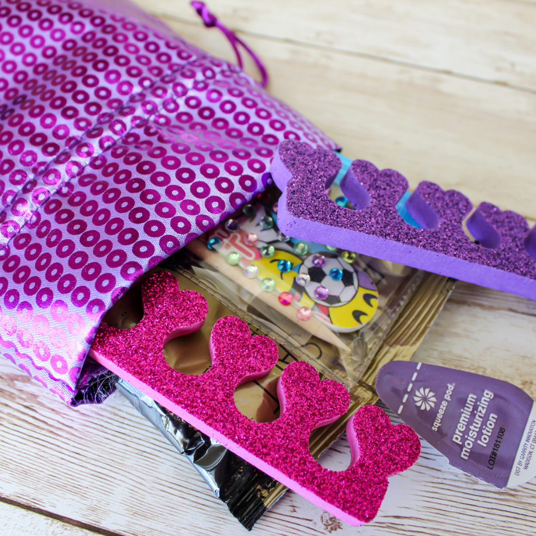 Perfect party favors for your teens & tweens spa party (who am I kidding? I'm trying not to hang on to a couple for myself!). Each set comes in a satin drawstring bag that can be used, washed, reused, repeat.
